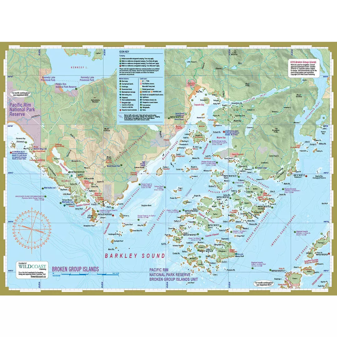 About this mapsheet: This mapsheet packages the waters on the west shore of Barkley Sound from Ucluelet to Toquaht Bay including all of the Broken Islands and a portion of the Deer Group for a regional perspective. Those visiting all of Barkley Sound will want to ensure they have mapsheet #211 for the eastern extent of Barkley Sound including the Deer Group, Bamfield and approaches from Alberni Inlet.