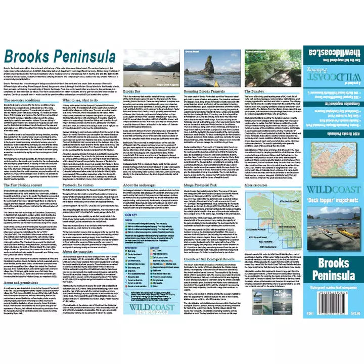 About this mapsheet: This map perfect for those heading to Brooks Peninsula. Use it in conjunction with #106 North Vancouver Island if you are arriving from the north, or #202 Kyuquot Sound if arriving from the south. The area includes from Heater Point in Side Bay, all of Brooks Peninsula Provincial Park plus Checleset Bay Ecological Reserve and the Bunsby Islands -- many of the best areas to explore in British Columbia. Boaters will want to use it for orientation including anchorages in Klaskino Inlet, Klaskish Inlet, Columbia Cove and other refuges as well as for an overview of the entire region's shoreline, rock by rock. Perfect for visual orientation in addition to other navigation resources such as paper and electronic charts that lack the ease-of-use that Deck Toppers provide. The reverse side includes travel information, facts, history and safety considerations perfect for anyone visiting the area. Consider it the essential travel companion for anyone visiting Brooks Peninsula or for anyone simply dreaming of visiting this remarkable location.