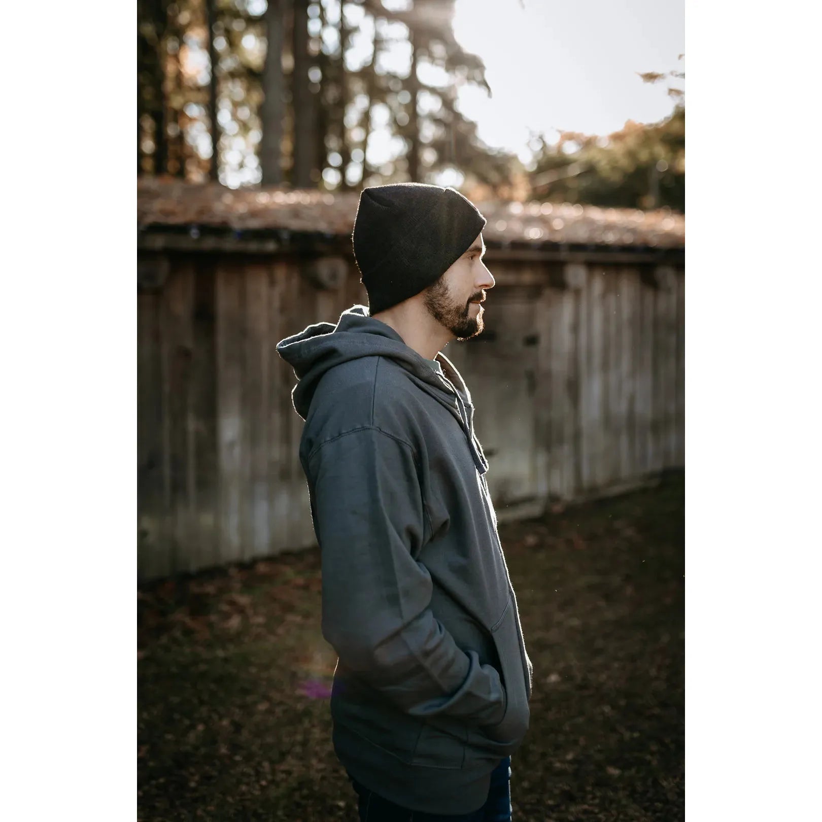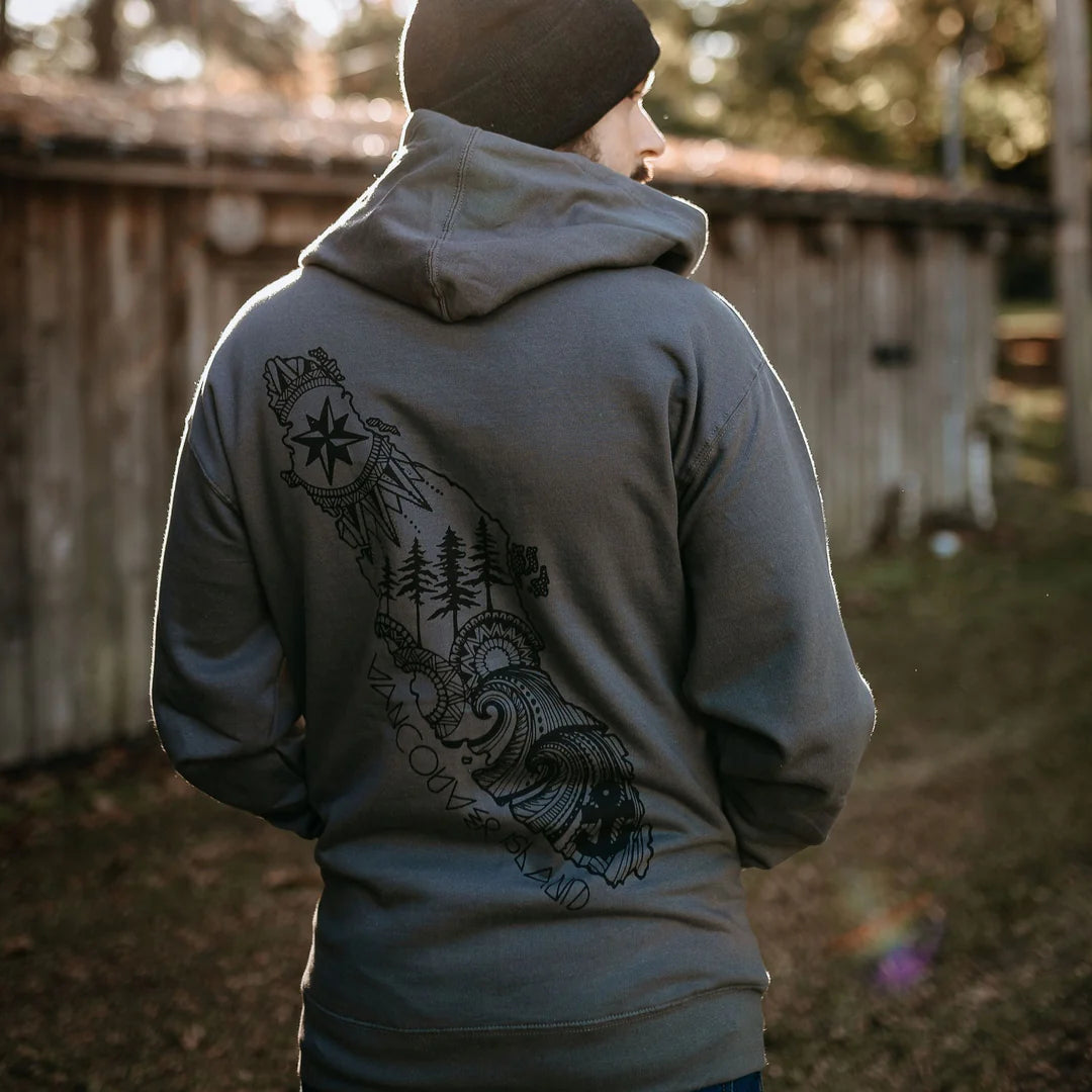 This medium-weight, Charcoal zip up hoodie is a classic and comfortable fit. Hand drawn Vancouver Island design printed locally using Eco Friendly Inks.